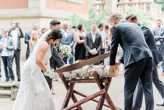 This old custom happens right after the wedding ceremony. The newlyweds will use a long, two-handled saw to cut a log. The log sits on a sawbuck, so the couple will have to pull and push equally to get the job done.
